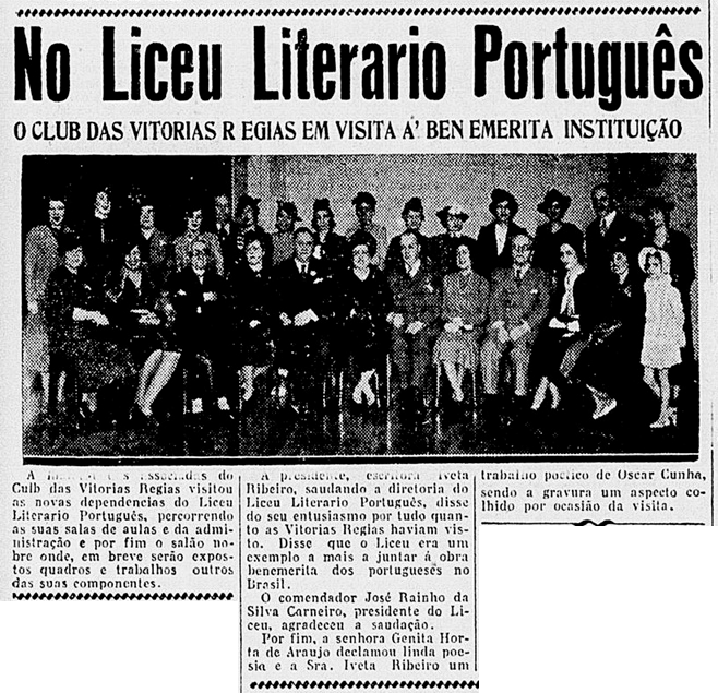 EXPOSIÇÃO Vitórias-Régias. A Noite, Rio de Janeiro, 2 out. 1938, p. 10. Disponível em: https://memoria.bn.gov.br/DocReader/DocReader.aspx?bib=348970_03&Pesq=%22Vit%c3%b3rias%20R%c3%a9gias%22%20%22Liceu%20Liter%c3%a1rio%20Portugu%c3%aas%22&id=317400641138&pagfis=57872.