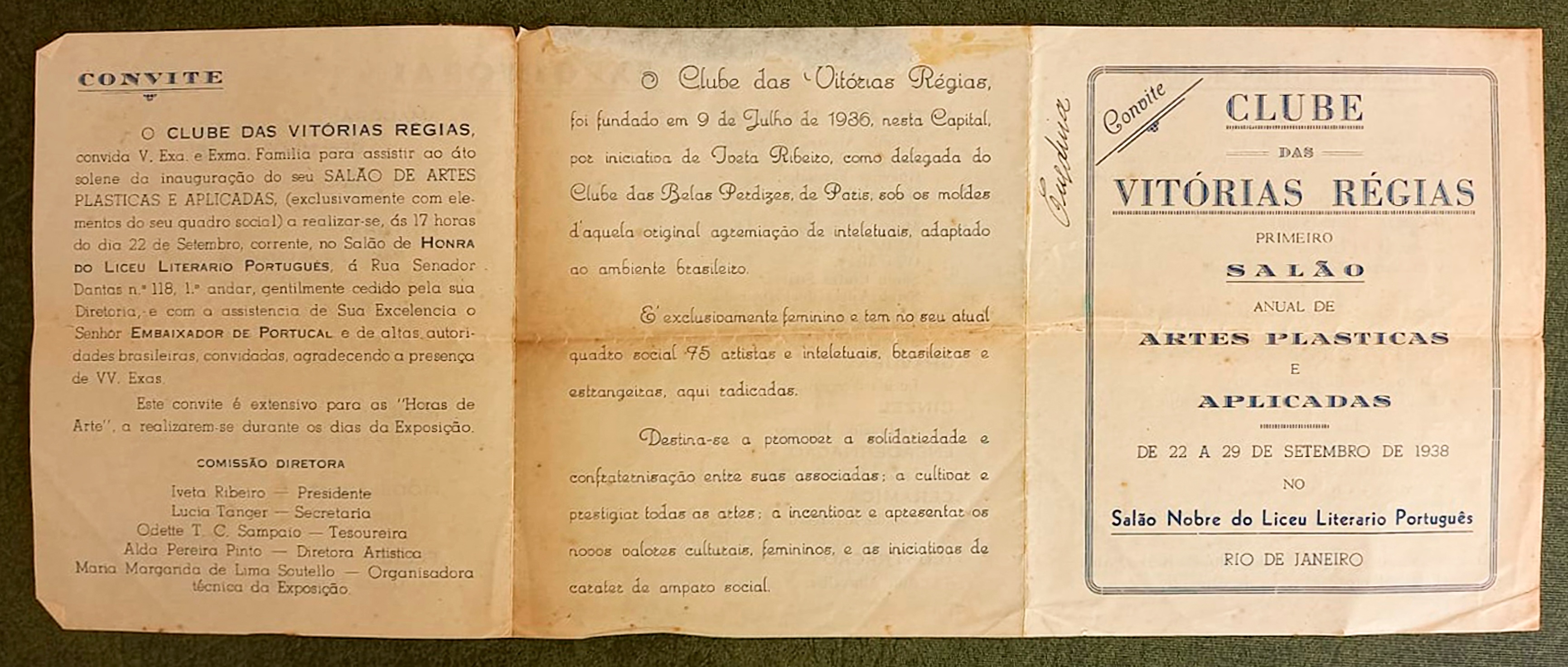 CONVITE. Clube das Vitórias Régias — Primeiro Salão Anual de Artes Plásticas e Aplicadas — De 22 a 29 de setembro de 1938 no Salão Nobre do Liceu Literário Português — Rio de Janeiro. Acervo Maria Angela Amaral do Valle.