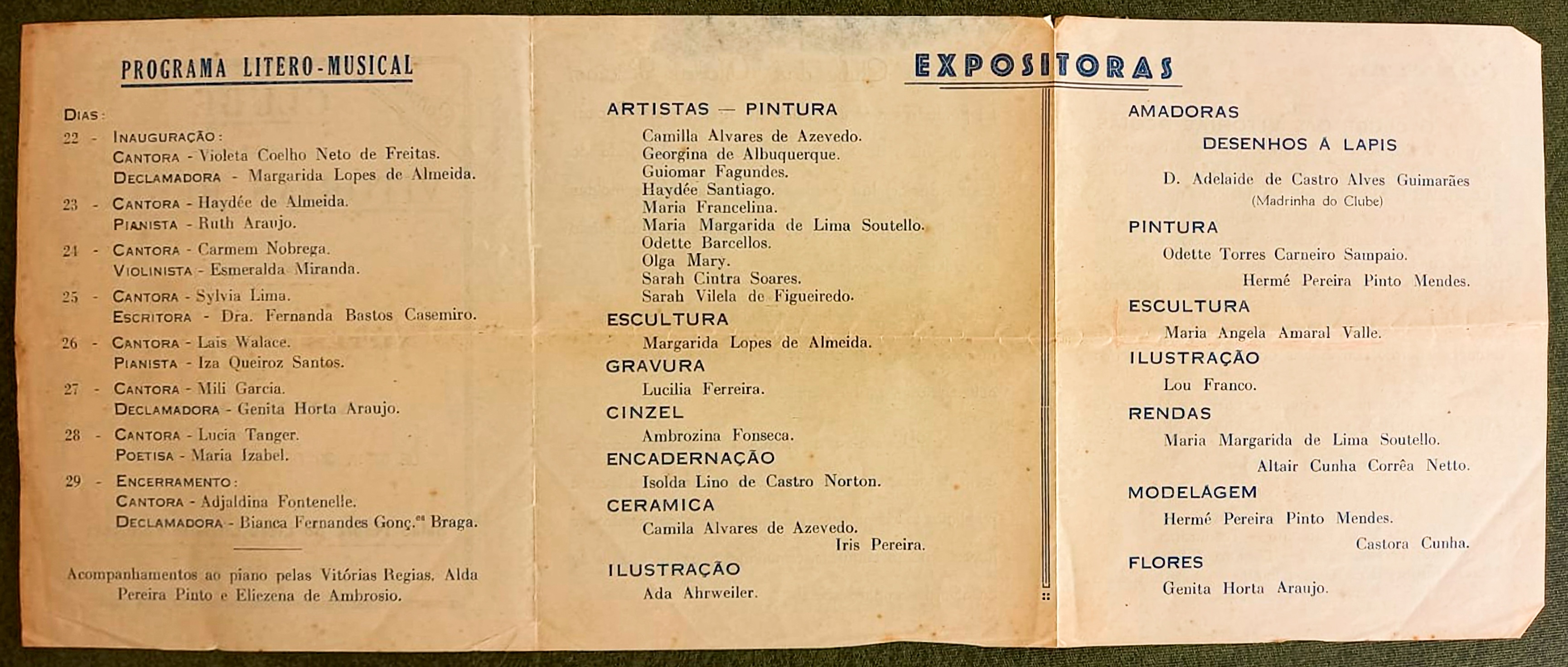 O folheto do Salão — compartilhado conosco pela Prof.ª Angela Cunha da Motta Telles — é valoroso no que revela do prestígio social do grupo e das redes de sociabilidade feminina então existentes no Rio de Janeiro dos anos 1930. Angela Telles, vale destacar, é Diretora Vice-Presidente do Real Gabinete e filha de Maria Angela Amaral do Valle, uma das artistas participantes da exposição, e de Ovídio Gouveia da Cunha, que depois veio a ser Diretor do Liceu.